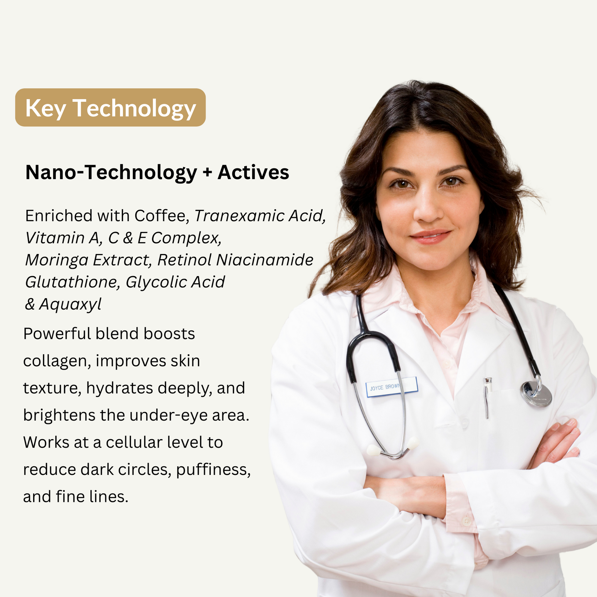 - Niacinamide: Brightens dark circles and improves skin tone.